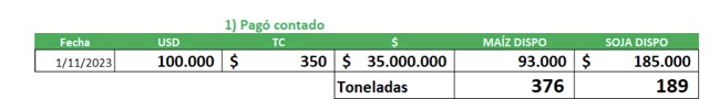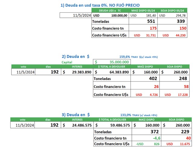 En tanto si decidiera abonar con maíz disponible , sólo en el caso de haber convenido tomar deuda en pesos al 133%, se ahorraría 4,6 tn. De haber tomado deuda en dólares, no fijando el precio deberá desprenderse de 175 tn. adicionales, un valor a actual de U$s 31.731.
