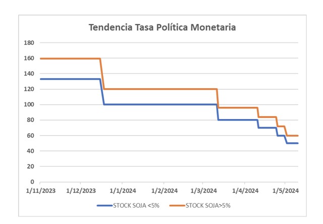 Sin embargo , la Com. A 7630 del BCRA, hasta el 30.06.2024, castiga a los productores que conserven más del 5% de su stock de soja, con una tasa nominal de interés del 120% de la tasa de política monetaria. Gráficamente, desde noviembre dicha tasa pasó escalonadamente del 133% al 50%. (159,6%-60% para productor con existencias).