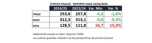 Sin embargo , las proyecciones de citado informe, para campaña 2024/25 para la oleaginosa, aportarían casi 17M tn. adicionales respecto a la anterior (+15%) , como muestro en el siguiente resumen comparativo de stocks finales para los tres cultivos.