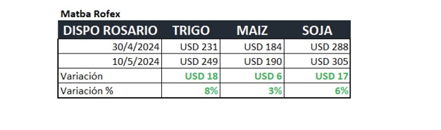 En plena cosecha gruesa y la necesidad de satisfacer compromisos por alquileres , compras de insumos y deudas, tomemos como referencia la variación desde el 30/04, en el disponible con entrega Rosario en nuestro mercado Matba-Rofex, de acuerdo la siguiente cuadro que muestra los cambios en dólares y en porcentaje.