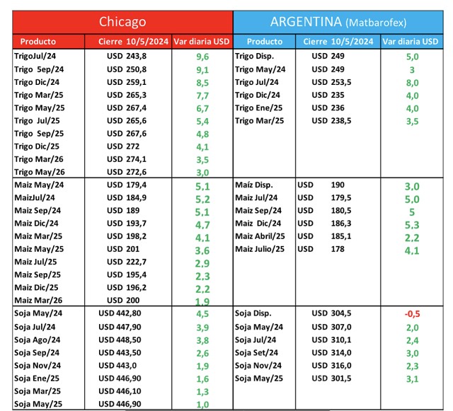 El pasado viernes 10/5 se publicó el informe del USDA, y el mercado de Chicago se vistió de verde