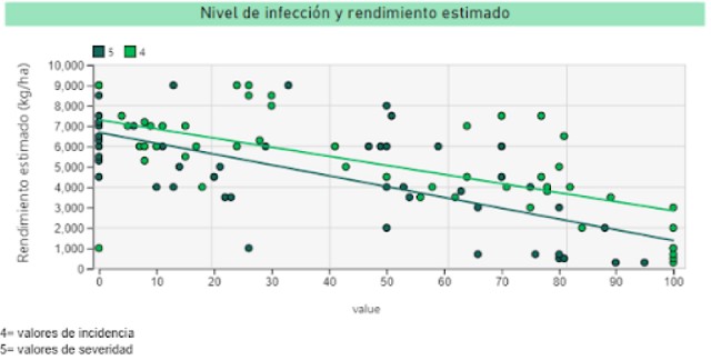 Como se mencionó anteriormente, es la enfermedad quien genera los grandes impactos en el rendimiento, y es por tal motivo que otro de los análisis consistió en evaluar los datos de incidencia y severidad registrada por los usuarios y cruzarlos con los datos de rendimiento estimado para los mismos monitoreos.