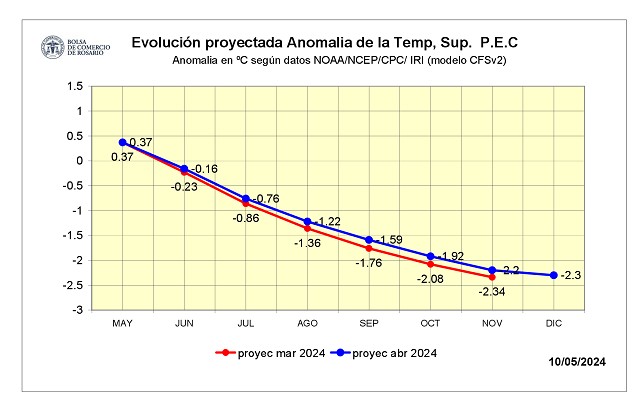 Si bien se sigue proyectando una Niña fuerte, la evolución proyectada con los datos actualizados muestra que sería menos fuerte que en abril. Esto puede observarse en el siguiente gráfico: