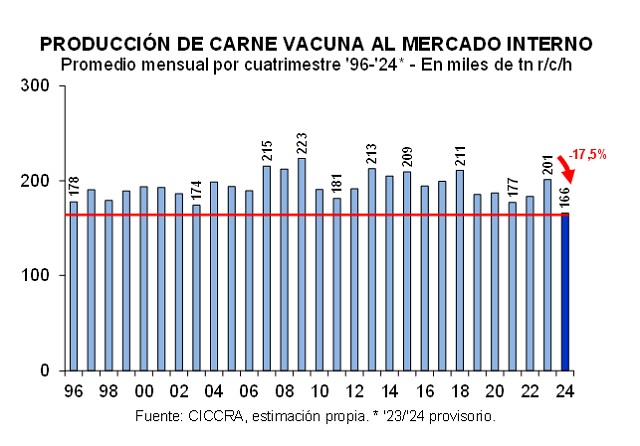 Y la producción fue equivalente a 988 mil tn r/c/h de carne, lo que arrojó una baja de 7,7% interanual. La oferta de carne vacuna se contrajo en 82,4 mil tn r/c/h entre los primeros cuatro meses de 2023 y 2024.