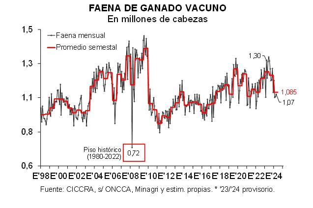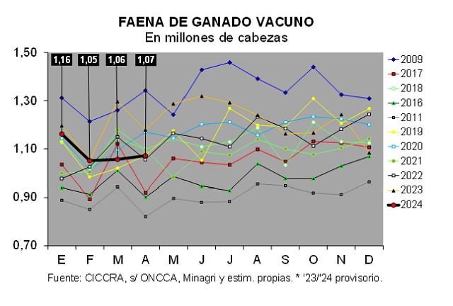 En total se faenaron 1,072 millones de cabezas de hacienda vacuna en abril de 2024. En comparación con la faena de marzo se observó una mejora de 3,8%, corrigiendo la serie por el número de días laborables. En cambio, al comparar con abril de 2023 la faena fue 9,1% menor, caída que llegó a 15,3% si se corrige la serie por el número de días laborables.
