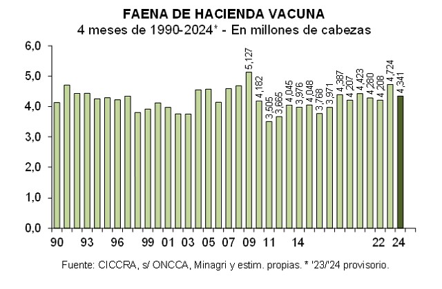 En el cuatrimestre enero-abril de 2024 operaron 353 establecimientos que faenaron un total de 4,34 millones de cabezas de hacienda vacuna. En términos interanuales la faena disminuyó 8,1% (-9,1% si se corrigen los datos por el número de días laborables), es decir que resultó menor en 382,5 mil cabezas. Entre los últimos 45 años, el primer cuatrimestre de 2024 se ubicó en el puesto Nº 18.