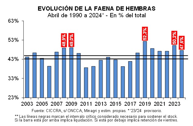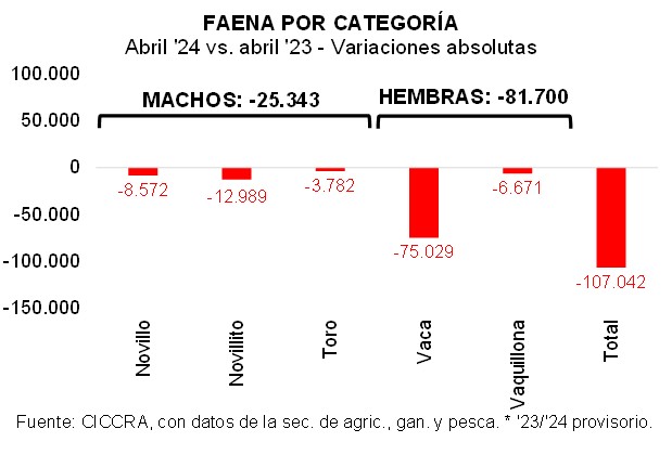 Cabe destacar que por primera vez en casi un año y medio, la faena de hembras registró un ajuste mayor al de la faena de machos. Se faenaron 510,0 mil hembras en abril de 2024, lo que arrojó una baja de 13,8% interanual (-81,7 mil cabezas). De esta forma, su importancia en la faena total se contrajo 2,6 puntos porcentuales en relación a abril del año pasado, ubicándose en 47,6%.