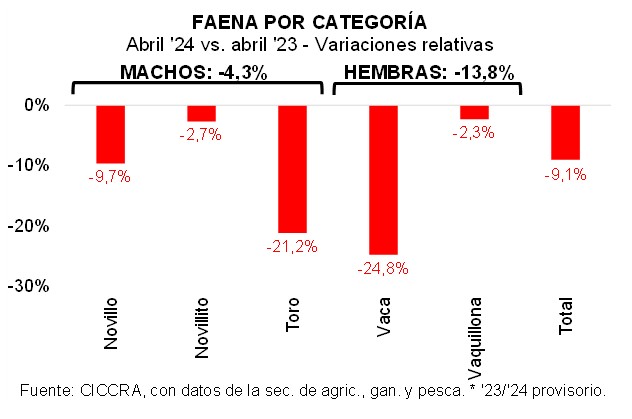 La faena de machos ascendió a 2,297 millones de cabezas en los primeros cuatro meses del año. Del total, 83,1% fueron novillitos (1,909 millones de cabezas) y 14,0% fueron novillos (322,05 mil cabezas). En relación al primer cuatrimestre de 2023 la faena de machos descendió 8,3% (-208,2 mil cabezas). En el caso de los novillitos la caída fue de 7,1% (-145,5 mil cabezas) y en el de los novillos fue de 15,8% en novillos (-60,4 mil cabezas).
