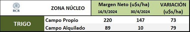 Según la última actualización de precios al 16 de mayo, los márgenes en campo propio han mejorado en 73 u$s/ha respecto a 15 días atrás, pasando de 147 u$s/ha a 220 u$s/ha. En campo alquilado, también han mejorado en 79 u$s/ha, pasando de un incipiente margen positivo de 10 u$s/ha hace dos semana atrás, a 89 u$s/ha hoy.