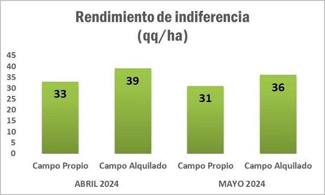 Estos movimientos de precios han impactado sobre los rindes de indiferencia del cereal, con una significativa reducción. En dos semanas, pasaron de 39 qq/ha a 36 qq/ha en campo alquilado. Y en campos propio pasó de 33 qq/ha a 31 qq/ha. Esta los márgenes y su consecuente impacto en los rindes de indiferencia es una tendencia que se viene dando desde febrero cuando se alcanzó el máximo valor de 52 qq/ha y en aquel momento se tornaba inviable hacer trigo.