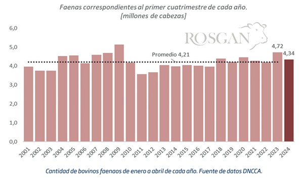 En los primeros cuatro meses del año, el total de animales faenados asciende a 4,34 millones, esto es un 8% menos respecto de los 4,72 millones faenados en los mismos cuatro meses de 2023, pero todavía una de las faenas más altas de los últimos años, para este primer cuatrimestre.