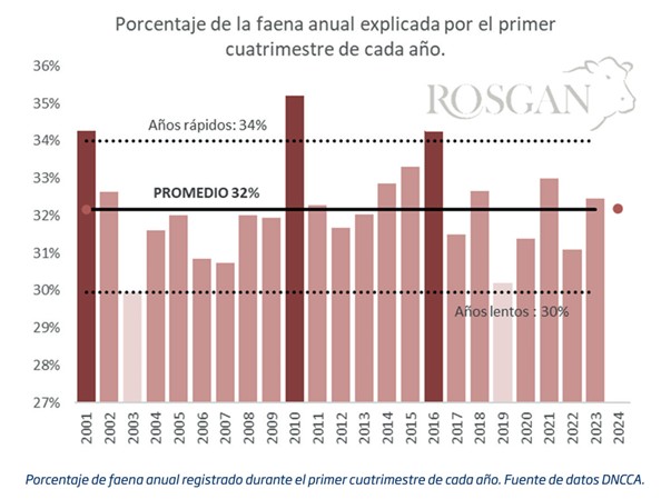 Estadísticamente, si tomamos el período que va de 2021 a 2023 inclusive, en promedio, la faena del primer cuatrimestre del año explica el 32% de la faena anual, por supuesto con presencia de años más rápidos y años de salidas a faena más lentos que, en conjunto, configuran un rango de variación que puede ir del 30% al 34 o 35%.