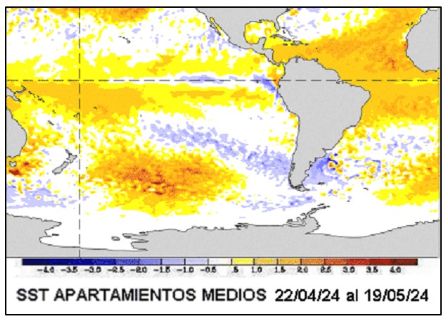 La evolución del indicador ENSO (Niño/Niña) a lo largo del último mes, se mantuvo dentro de lo que marcaron las previsiones. La tendencia hacia la neutralidad es progresiva. Veremos si los cambios en el patrón oceánico de anomalías de la temperatura superficial del mar se siguen acelerando durante lo que resta del presente mes. Por lo pronto, la anomalía cálida sigue presente en Pacífico Ecuatorial central. La mezcla con el agua más fría emergente sobre las costas progresa hacia el centro pero aun no logra neutralizar el calentamiento. Este proceso aún puede considerarse incipiente.