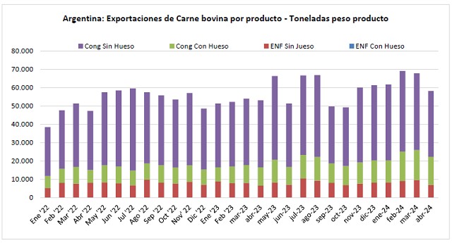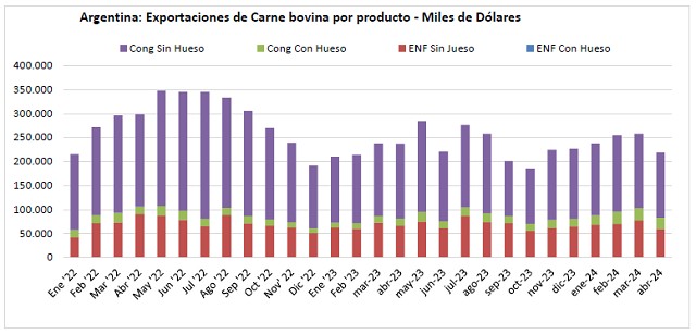 Las exportaciones del mes de abril de 2024 alcanzaron un volumen cercano a las 58,3 mil toneladas peso producto de carne bovina refrigerada y congelada; por un valor del orden de los 219,0 millones de dólares. Con respecto al mes de marzo de 2024, los volúmenes embarcados muestran una significativa caída, del (-14,1%); mientras que el valor obtenido muestra un retroceso del (-15,1%)