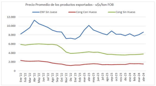 El precio promedio de exportación de carne bovina refrigerada y congelada resultó en el mes de abril de 2024 de u$s 3.755 por tonelada. Este valor resulta un (-1,1%) inferior al obtenido en marzo último; y un (-16,0%) más bajo que el precio medio de abril de 2023, que había sido de u$s 4.469 por tonelada. En los últimos años, se observa una persistente tendencia a la baja de los precios en los principales destinos desde el mes de mayo de 2022 en adelante; y los u$s 3.755 dólares promedio por tonelada obtenidos en el mes de abril se ubican más de u$s 2.500 por tonelada por debajo de los máximos registrados en abril de 2022.