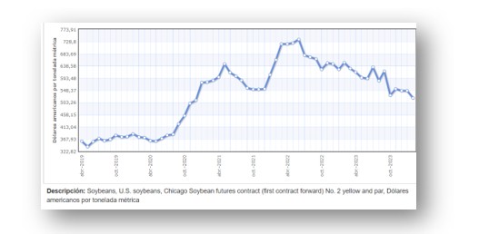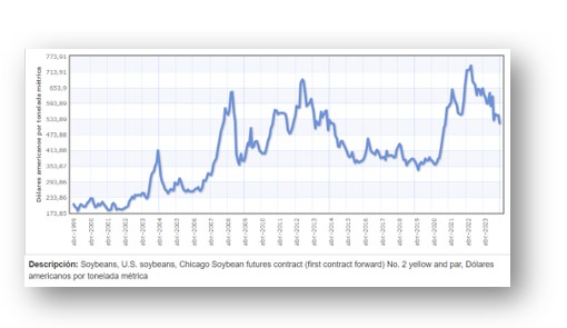 En el cuadro siguiente, podemos ver la evolución del precio internacional de la soja, desde diciembre de 1999 hasta febrero de 2024.