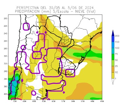 Al inicio de la primera etapa de la perspectiva, se producirá el paso de un Frente de Pampero, causando precipitaciones moderadas a abundantes sobre el extremo oriental de la Región del Chaco, el extremo sudeste del Paraguay y el extremo norte de la Mesopotamia, y registros escasos a nulos sobre la mayor parte del área agrícola, mientras la Cordillera Sur recibirá tormentas de moderada intensidad. La circulación polar que viene predominando a lo largo de la segunda parte del Otoño genera condiciones propicias para la ocurrencia de nevadas ligeras en gran parte del Cono Sur (líneas en violeta), pero la entrada de aire marítimo hace que se conviertan aguanieve, o directamente en lluvias de escasa entidad, provocando tiempo frío, nublado y húmedo. Sólo el área en el noroeste de la Patagonia (línea en rojo obscuro) podría recibir nevadas de entidad.