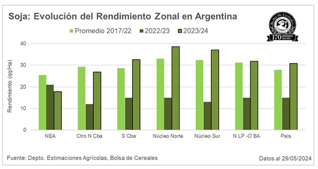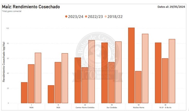 Por último, a la espera de una reducción de humedad en grano la cosecha de maíz comercial avanzó lentamente en parte del norte y centro del área agrícola alcanzando un avance del 30,1 % a nivel nacional, lo que significa un retraso respecto del promedio 2018/22 de -5,9 puntos porcentuales. El rinde medio nacional se ubica en 80,5 qq/Ha, pero a medida que entran las maquinas en lotes de siembra tardía el rendimiento promedio nacional cae, ya que con un 6,5 % de los planteos tardíos cosechados su rinde promedio es de 58,2 qq/Ha. Hacia la zona más afectada comprendida por el norte de Córdoba, centro de Santa Fe y Entre Ríos el rinde medio de planteos tardíos hasta el momento apenas supera los 30 qq/Ha, situación prevista semanas atrás. En este contexto, sostenemos nuestra proyección de producción en 46,5 MTn, lo que significa un aumento interanual de 25,7 %.