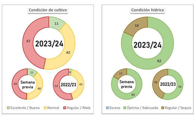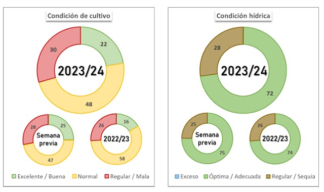 No obstante, en comparación al ciclo previo, afectado por condiciones de humedad sumamente restrictivas para la siembra se mantiene un adelanto de 3,4 p.p. El escenario favorable en términos de oferta hídrica y la mejora del margen bruto del cereal motiva a los productores a incrementar el área a sembrar, dando lugar a una expansión interanual hasta el momento de un 5,1%. De la misma forma, se inicia la siembra de cebada, con un avance de 3,4 % a nivel nacional. Las labores de siembra se concentran sobre la región central, donde la humedad superficial ha permitido el ingreso de las sembradoras. Asimismo, óptimas condiciones hídricas han permitido el avance de las labores sobre los núcleos cebaderos del sur.