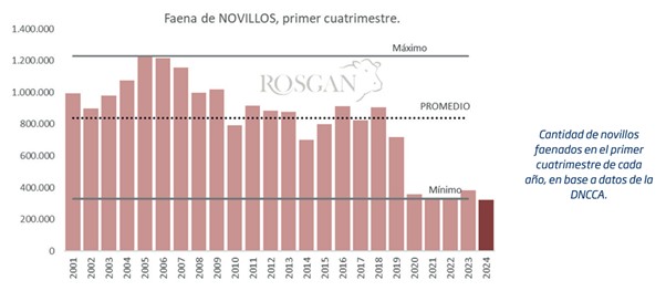 Los datos del último stock al 31 de diciembre de 2023 mostraron un total de 2,33 millones de novillos, la cifra más baja desde que se llevan registros y menos de la mitad de las existencias registradas a fines de 2007, previo a la primera gran liquidación de los últimos 30 años.
