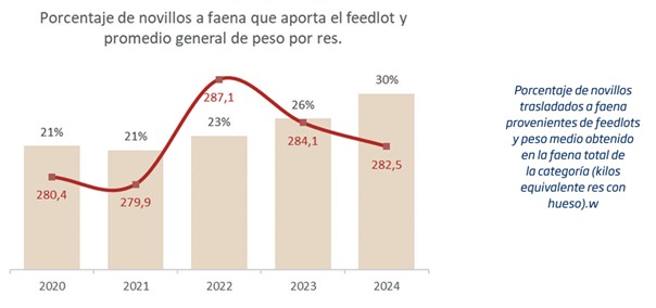 De acuerdo con los datos que informa el SENASA, en base a los DTe de traslado de hacienda, vemos que en los últimos 5 años -2020 a 2024- período de clara baja y estancamiento de la faena de novillos -siempre medido para el primer cuatrimestre de cada año- del total de animales trasladados a faena se observa un porcentaje creciente en el aporte del feedlot. A su vez, un dato no menor que complementa esta tendencia es la caída en los pesos medios de faena que se observa en, al menos, los últimos tres años.