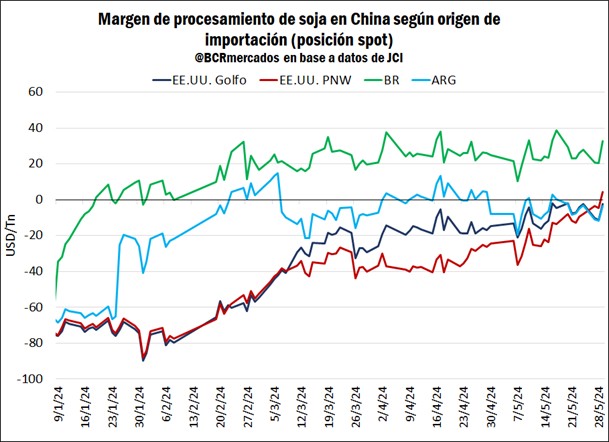 En cuanto a los orígenes de importación de China, Brasil es el país que mejor cierra para los márgenes de molienda de las industrias del país asiático mirando la serie “spot” o entrega corta. Por su parte, Argentina ha tenido algunos momentos donde ha sido atractiva para dinamizar los negocios de importación de China y probablemente haya sido el factor que permitió crecer en las ventas de exportación. Mientras que, Estados Unidos no estuvo siendo para nada atractivo como origen de importación hasta mediados de mayo, pero actualmente los números empiezan a cerrar. Para lo que sería los meses de entrega a partir de septiembre/octubre, los embarques estadounidenses con salida desde el Golfo brindan margen positivo a las fábricas chinas, pero Brasil continúa siendo una mejor opción por el momento. A nivel de mercado, esto explicaría porqué China aún no realizó ninguna compra de soja para la descarga 2024/25 con origen en el país del norte. Con el correr de las semanas se tendría que dar la transición de demanda desde el hemisferio sur al norte, pero este año se agregan factores geopolíticos que podrían tensionar el comercio entre ambos países.