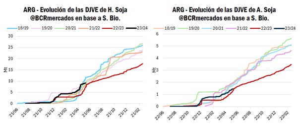 A nivel internacional, el papel de China claramente es un factor clave al analizar el mercado de soja, dado que representa el 60% de las importaciones mundiales del grano sin procesar. En el primer trimestre del año realizó importaciones por 18,58 Mt de soja, 4,4 Mt menos que en igual período de 2023 y un mínimo desde 2020. A pesar de las menores importaciones, los stocks de soja, harina y aceite aumentaron en los puertos chinos, lo cual marcó una caída de la demanda a nivel doméstico y terminó presionando a la bajo los precios.