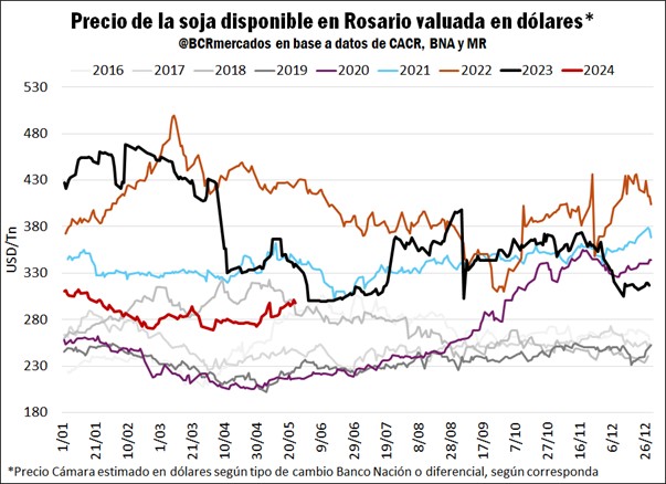 Los stocks en puertos ya se normalizaron y la semana pasada se informó un repunte importante en las importaciones de soja en abril y es probable que en mayo se mantenga un buen volumen dado el programa de exportación conjunto de Brasil, Estados Unidos y Argentina. No obstante, de cara a las próximas semanas el line-up está perdiendo fuerza y es probable que se reduzcan los stocks nuevamente. En caso de que se presente este escenario, podría ser un factor que brinde sostén a las cotizaciones. No obstante, también será importante cómo avance el clima en Estados Unidos y su programa de exportación 2024/25, que aún trae mucha incertidumbre.