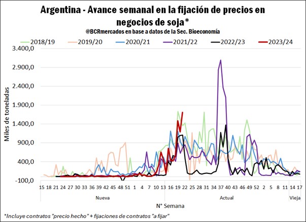 No obstante, en perspectiva de lo que fue la precampaña de soja 2023/24, la estrategia comercial fue atípica respecto a años anteriores, dado que se realizaron muy pocos negocios con precio hecho y se decidió dejar una alta proporción de contratos a fijar precio. Hasta finales de febrero, solo 0,7 Mt tenían precio firme a pesar de que se habían realizado negocios por 7,96 Mt. Recién a comienzos de marzo se comenzó a mover un poco el volumen de negocios bajo la modalidad precio hecho y ahora en mayo, se están alcanzando picos pocas veces vistos en las últimas campañas. Esto dejando de lado los volúmenes semanales récord que se llegaron a operar en la campaña 2021/22, cuando se implementó el primer “dólar soja” (PIE I) en septiembre de 2022.