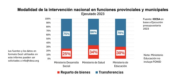 Estos datos muestran que la modalidad del Estado nacional de comprar bienes para repartirlos entre las provincias, los municipios y las organizaciones sociales (entre las que hay prestigiosas ONGs e innumerables cooperativas piqueteras) es una práctica extendida y arraigada. En los tres ministerios nacionales que más se involucran en funciones provinciales y municipales, entre el 25% y 33% de las ayudas nacionales se hacen comprando centralizadamente bienes (alimentos, remedios, vacunas, libros, etc.) para ser repartidos entre ONGs, centros de salud y escuelas que dependen de las provincias y sus municipios.