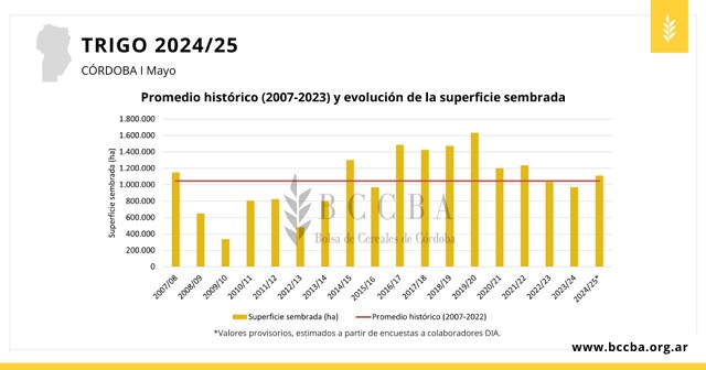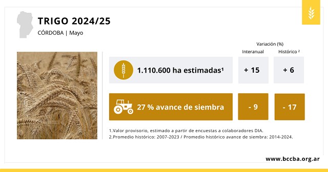 Según datos provistos por la red de colaboradores DIA durante el mes de mayo, se sembrarían 1,1 millón de hectáreas de trigo en la provincia, 15% más que la campaña 2023/24. Al momento, el avances de siembra es de 27%, 9 puntos porcentuales por debajo de la campaña precedente.