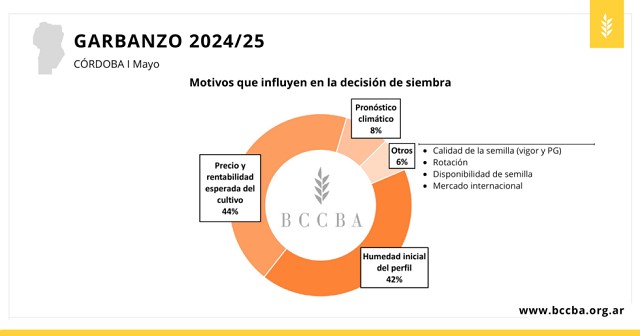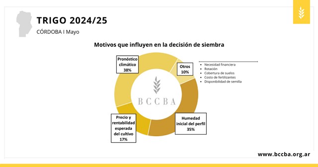 En mayo, tras la exitosa recarga de perfiles con lluvias del mes pasado, el pronóstico climático y la humedad inicial del perfil son los principales factores que influyen en la decisión de siembra. Por su parte, el precio y rentabilidad esperada del trigo inciden en menor medida. Otro factor mencionado con frecuencia es la rotación de cultivos. Frente al contexto sanitario actual con relación al complejo de achaparramiento de maíz, se plantea como mejor opción una secuencia trigo-soja.