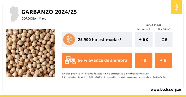 Con más del 50% de los lotes sembrados, se estima una superficie de 25.900 hectáreas de garbanzo, siendo esta superficie 58% superior a la sembrada en la campaña anterior.