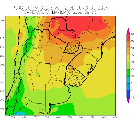 Al inicio de la perspectiva, continuarán soplando los vientos del trópico, que hicieron su entrada en los días precedentes, llegando con fuerza al norte y el centro del área agrícola, donde producirán máximas sobre lo normal, pero sin lograr llegar al sur, que continuará bajo el dominio de los vientos polares, observando registros normales a bajo lo normal. A continuación, se producirá el paso de un frente de Pampero, con muy escasa actividad, produciendo precipitaciones escasas a nulas en la mayor parte del área agrícola, salvo algunas franjas de registros escasos sobre el este del NOA, el este de la Región Pampeana y el Uruguay, donde se darán condiciones para la ocurrencia de nevadas muy ligeras, que probablemente no se concreten. Sólo la Cordillera Central y Sur observarán tormentas de gran intensidad, con posibles nevadas ligeras. Los vientos polares, que acompañarán el paso del frente, producirán temperaturas mínimas bajo lo normal en la mayor parte del área agrícola, con heladas generales y localizadas en las zonas serranas del oeste, pero con escaso riesgo de ocurrencia en la mayor parte del centro y el este del área agrícola.
