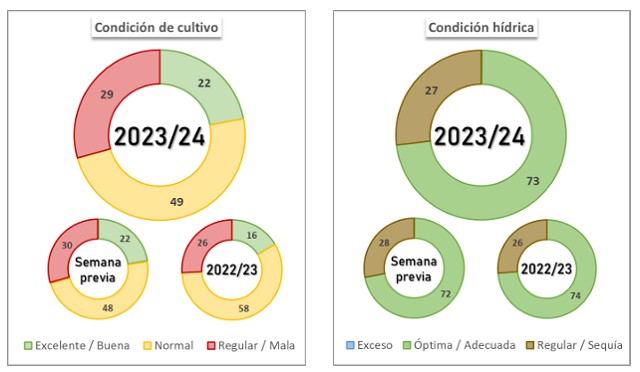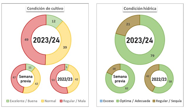La cosecha cubre el 35,1 % con un rinde promedio de 78,2 qq/Ha. En este contexto, mantenemos nuestra proyección de producción en 46,5 MTn, lo que significa una reducción de 4,3 MTn respecto al promedio 2018/23.