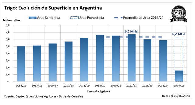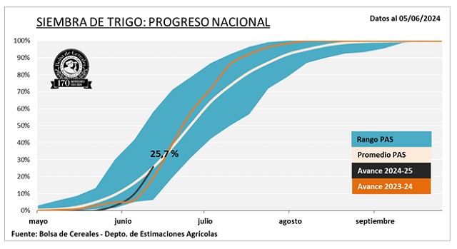 De las 6,2 MHa proyectadas, luego de un progreso intersemanal de 16 p.p., ya se encuentran sembradas el 25,7 %. Se mantiene una demora interanual de -7,1 p.p. respecto al promedio de las últimas 5 campañas.