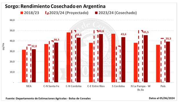 Para finalizar, la cosecha de sorgo granífero avanzó 11,1 puntos porcentuales en los últimos quince días, alcanzando al 53,1 % del total estimado. Los mayores avances se dieron en el centro norte del país, donde los rendimientos cosechados se ubican entre los 30 y 40 qq/Ha. Particularmente el NEA, que es la principal zona productiva, reporta resultados por debajo de lo esperado, con un rinde medio de 32 qq/Ha. Asimismo, en el Centro-Norte de Santa Fe los rendimientos disminuyen a medida que las cosechadoras entran en los lotes tardíos lo que podría impactar en la producción estimada. En este contexto, mantenemos nuestra proyección de producción en 3,5 MTn.