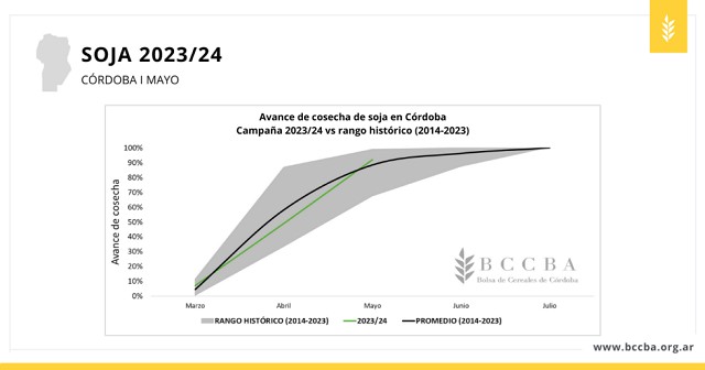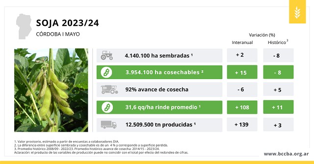 A pesar de esto, los rindes estarían siendo muy buenos, situándose 11 puntos porcentuales (p.p.) por encima del promedio histórico para la provincia y la producción estimada sería de 12,5 millones de tn, más del doble de lo obtenido en la campaña anterior.