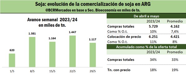 En este sentido, hasta la última semana de abril solo se había comprometido el 24% de la oferta total de soja 2023/24 en el mercado físico, por detrás del promedio de los últimos seis años. Al mismo tiempo, sacando la campaña pasada, en términos absolutos, el volumen total comprometido era el más escueto desde la 2013/14. Sin embargo, las compras acumuladas durante mayo llegaron a 5,7 Mt por soja, siendo el avance mensual más importante en cinco años y comprometiendo en treinta y un días el 10% de la oferta total. Además, entre contratos con precio hecho y fijaciones se fijaron precios a 6,2 Mt, pasando de mantener solo el 7% de la oferta total con precio durante abril y llegando al 18% de la oferta total a finales de mayo, casi que triplicando el volumen de mercadería cubierta en el físico.