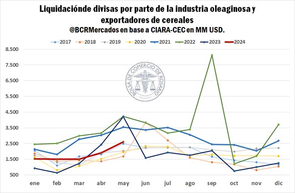 El avance más lento en la comercialización, la caída de los precios internacionales de los principales commodities agrícolas y el blend que implica que un 20% de las exportaciones se liquidan por los mercados bursátiles, explica la menor liquidación de divisas agro en el mercado oficial de cambios. Según el seguimiento de CIARA-CEC los principales exportadores agroindustriales liquidaron USD 9.046 millones en los primeros 5 meses del año, el menor valor desde 2020 para igual período.
