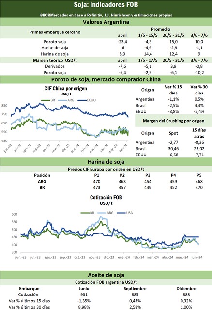 En este contexto, a la primera semana de junio, las primas por soja argentina se han estado fortaleciendo para el poroto y el aceite, mientras que pierden vigor para la harina, aunque se mantengan en positivo. Al tiempo que el margen teórico para la exportación del poroto se profundiza en terreno negativo, mientras que el margen teórico de la industria casi que cierra a la par habiendo pasado una semana en positivo.