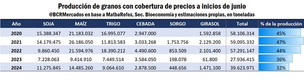 En esta línea, el repunte comercial por la oleaginosa no alcanzó para poner al día la fijación de precios entre el conjunto de los principales cultivos. La foto al comenzar el mes de junio revela un avance más lento que los últimos años en cuanto a toneladas cubiertas con precio en proporción a la producción total de los principales granos.