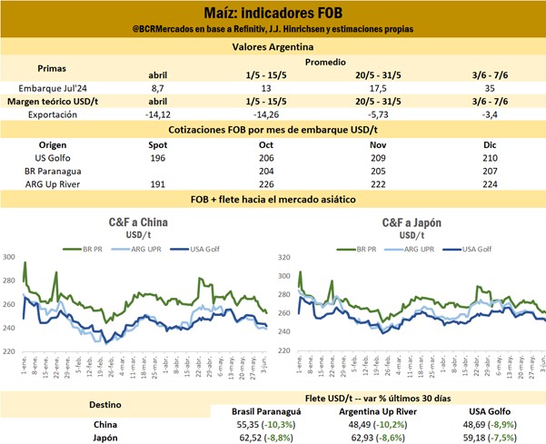 En este contexto, las primas contra Chicago se han estado fortaleciendo para el maíz argentino manteniendo la demanda por el cereal, mientras que el margen teórico para la exportación de grano ha mejorado en las semanas recientes, pero siempre mostrando un resultado negativo. Dada la estacionalidad de oferta a nivel mundial, el maíz argentino sigue siendo el más competitivo en precios, aunque pronto entrará la zafrinha brasilera y desde septiembre la oferta norteamericana.
