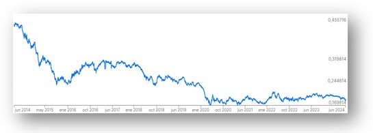 El gráfico siguiente nos muestra la evolución del real respecto al dólar a lo largo de los últimos 10 años.