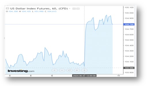 En el gráfico se advierte que, desde el 7 de junio, el dólar índice pegó un salto abrupto.