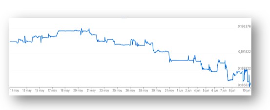 El gráfico muestra la evolución del real desde el 11 de mayo pasado. El real ha perdido en solo un mes cerca de un 4%.