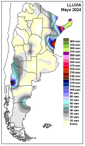 Como podemos ver en el mapa, los acumulados pluviales de mayo, presentan un claro corrimiento de los máximos hacia áreas mesopotámicas, principalmente hacia la provincia de Misiones, donde en los primeros días del mes ya se habían superado los doscientos milímetros. El centro este entrerriano presenta un máximo secundario y la zona de influencia de Bariloche, se destaca con más de ciento cincuenta milímetros, con intensas nevadas a comienzos de mes. También son abundantes las lluvias en el entorno de Comodoro Rivadavia.