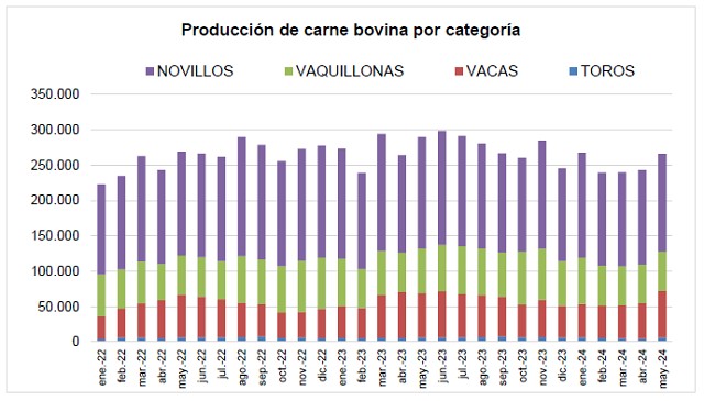 La producción de carne bovina del mes de mayo de 2024 alcanzó las 265,7 mil toneladas res con hueso, incrementándose en cerca poco más de 22,9 mil toneladas con respecto al mes anterior, y sin embargo retrocediendo en 23,9 mil toneladas con respecto al mes de mayo del año 2023. En los primeros cinco meses del año 2023, la producción de carne bovina alcanzó los 1,255 millones de toneladas equivalente res con hueso; situándose 105,4 mil toneladas por debajo del acumulado del período enero a mayo de 2023, que había ascendido a 1,360 millones de toneladas equivalente res con hueso.