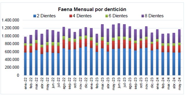 En los primeros cinco meses del año 2024, se faenaron 5,51 millones de bovinos; un (-8,3%) menos que los 6,01 millones que se habían faenado entre enero y mayo de 2023. Las mayores diferencias interanuales en la faena provienen de los machos de dos dientes, que recortaron en 168,3 mil cabezas la faena acumulada en los primeros cinco meses del año pasado, los machos de seis dientes, que mostraron una caída interanual de la faena cercana a las 84,8 mil cabezas, y, por las hembras de ocho y más dientes, cuya faena disminuyó en cerca de 97,5 mil cabezas a la registrada entre enero y mayo del año 2023.