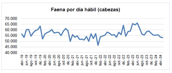 La faena diaria del mes de mayo del corriente año, se ubicó en 53,1 mil cabezas, un (-1,2%) por debajo de las 53,7 mil diarias procesadas en abril, y un (-17,5%) por debajo de las 64,4 mil correspondientes a mayo de 2023.